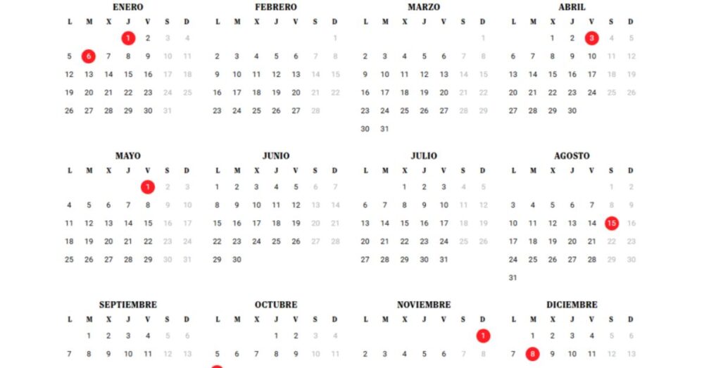 Además de estos puentes, el calendario laboral de 2026 incluye 14 festivos nacionales, de los cuales 9 son obligatorios en toda España: Año Nuevo (1 de enero), Viernes Santo (3 de abril), Fiesta del Trabajo (1 de mayo), Asunción de la Virgen (15 de agosto), Fiesta Nacional (12 de octubre), Todos los Santos (1 de noviembre), Constitución (6 de diciembre), Inmaculada Concepción (8 de diciembre) y Navidad (25 de diciembre).