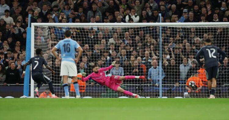 El guion del partido saltó por los aires antes de llegar al ecuador de la primera parte. Tras unas intervenciones milagrosas de Courtois ante Cherki y Rodri que mantuvieron el muro en pie, llegó el zarpazo: Vinicius Jr. rompió al espacio, estrelló un balón en la madera y, en el rechace, Bernardo Silva sacó el esférico con la mano sobre la línea.