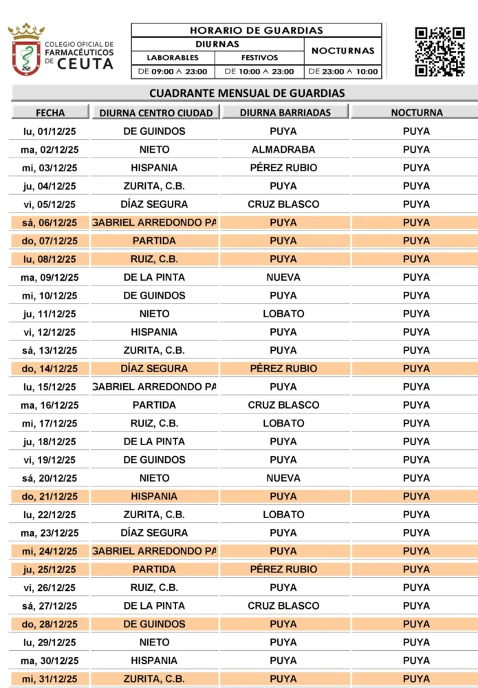 - Guardia en días festivos: Se mantiene siempre una farmacia abierta en cada zona de Ceuta.