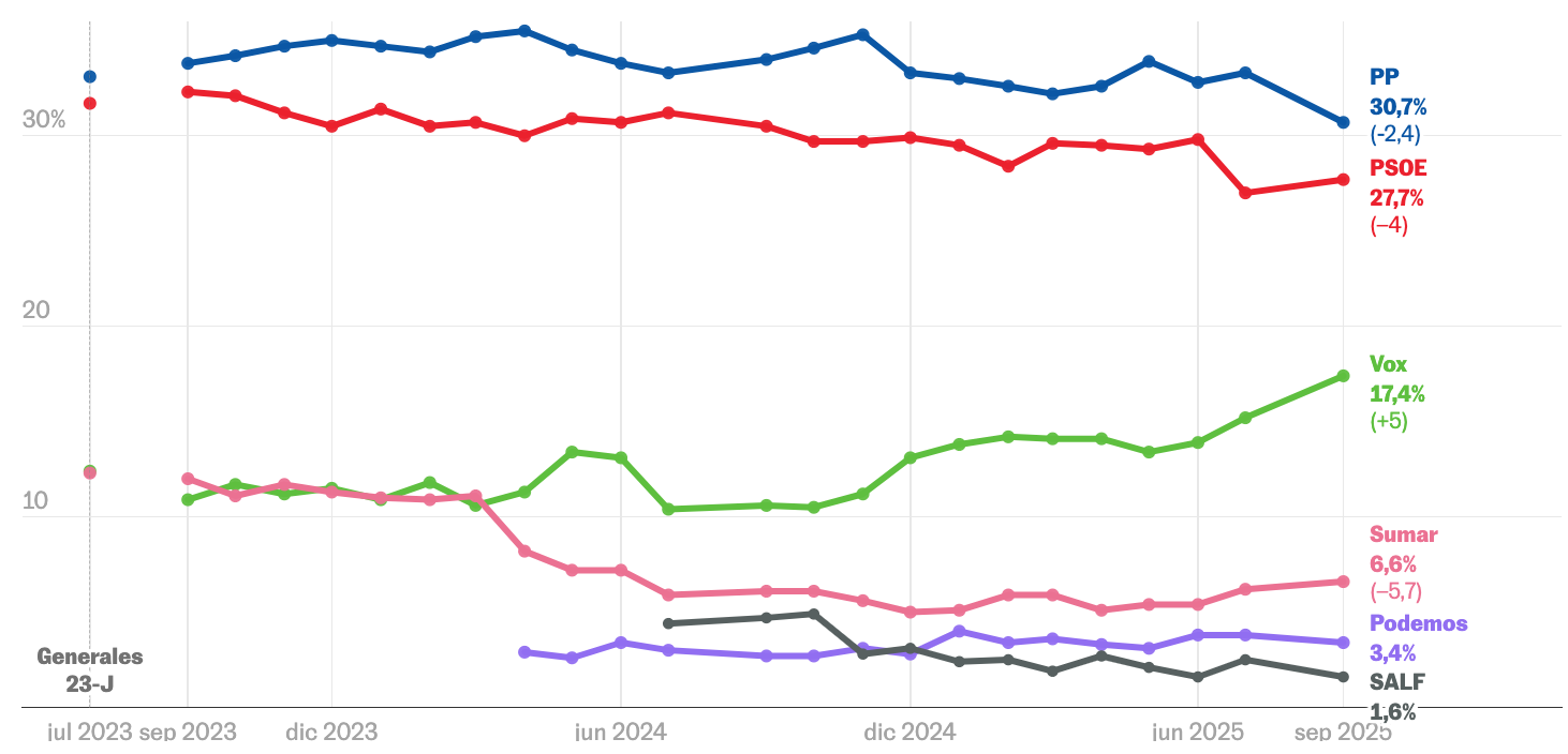 Este escenario reconfigura el tablero político: la derecha experimenta movimientos contrapuestos, con Vox en clara expansión y el PP debilitado, mientras el PSOE busca estabilizarse tras la crisis interna.