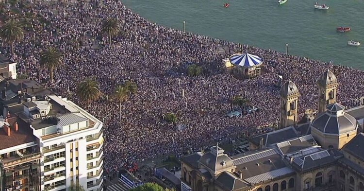 Durante la rúa de este lunes, el autobús descapotable de la comitiva txuri-urdin avanzó entre una multitud que portaba, junto a las bufandas del equipo, numerosas ikurriñas y banderas de Palestina. En el Palacio Consistorial, la plantilla fue recibida por las principales autoridades del territorio: el alcalde, Jon Insausti; la diputada general de Gipuzkoa, Eider Mendoza, y el lehendakari, Imanol Pradales.